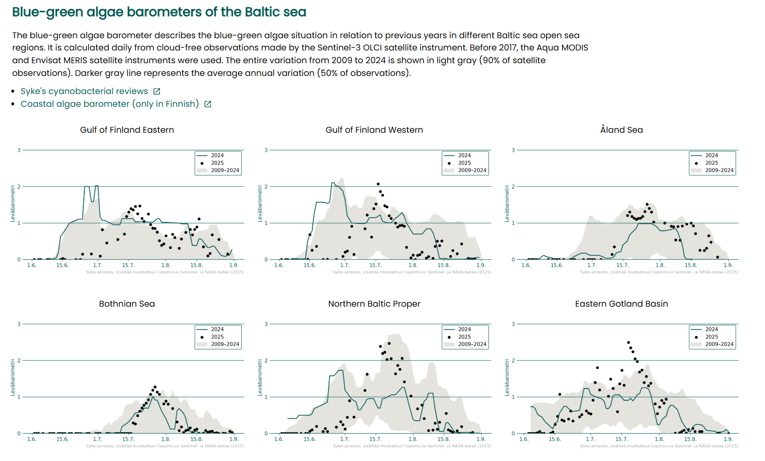 Algae barometers describe how algae conditions develop across different Baltic Sea regions during the summer. They are updated regularly from June to September.