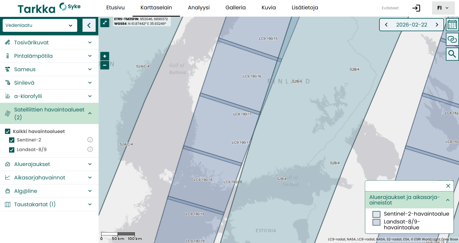 Selvittääksesi pitäisikö alueelta olla saatavilla korkean resoluution satelliittien havaintoja, voit lisätä karttanäkymään sekä Sentinel-2 että Landsat satelliitien päivittäiset havaintoalueet vasemman reunan aineistovalikosta kohdasta Satelliittien havaintoalueet