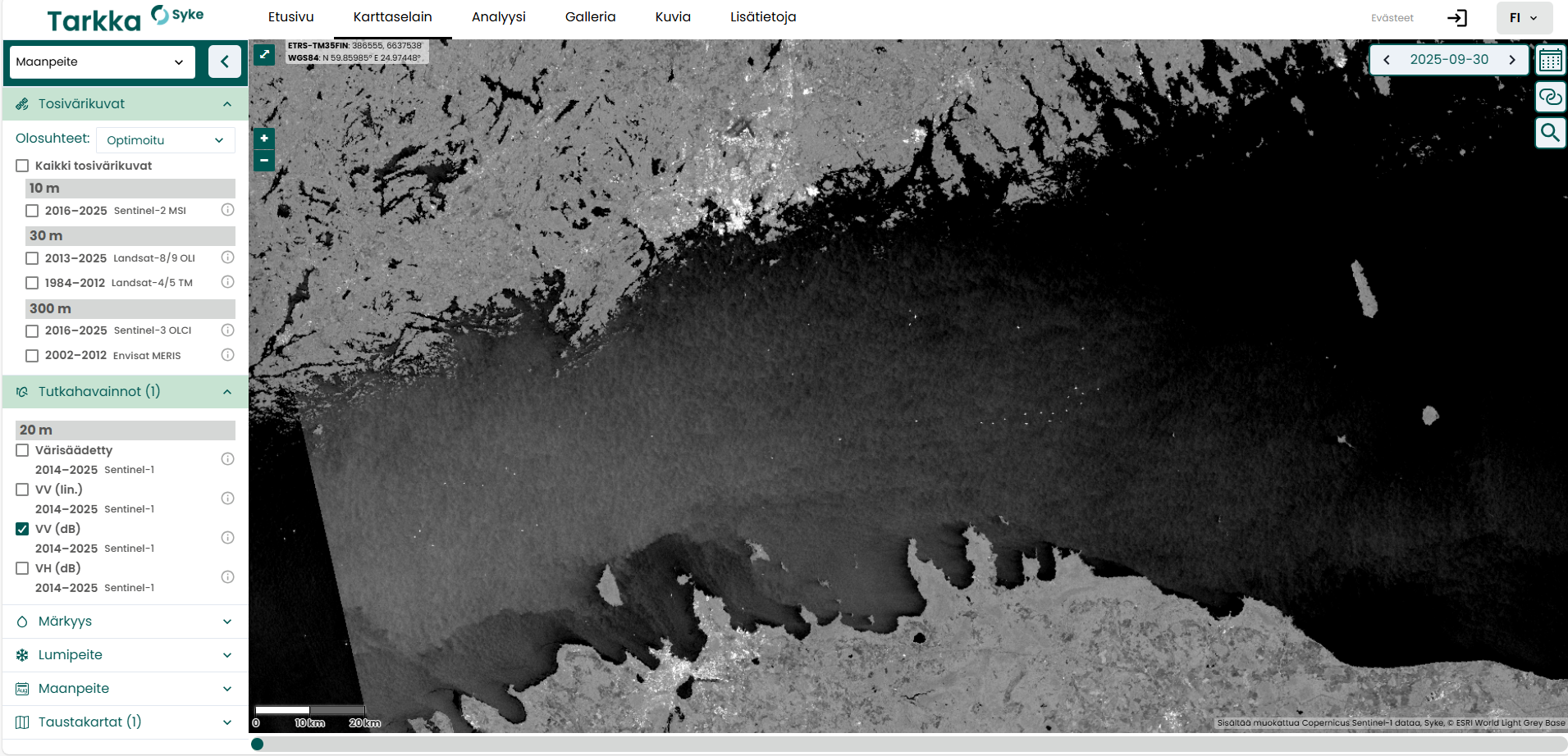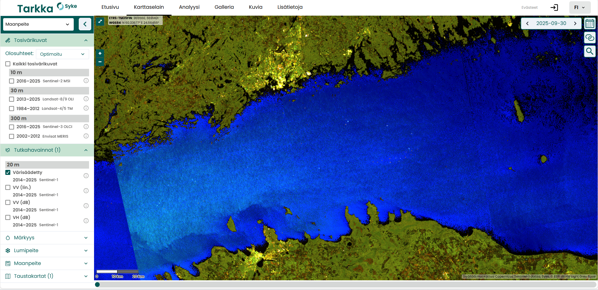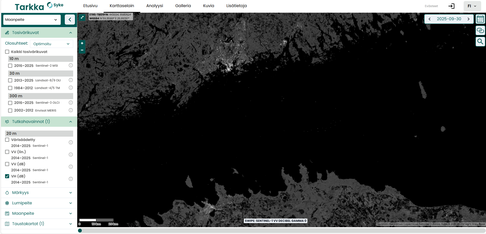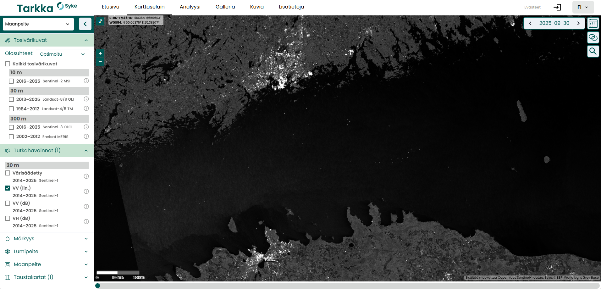 Tutkakuvien käsittelyssä hyödynnetään Sentinel-Hubin ja Sinergise Ltd:n tarjoamia aineistoja ja prosessointikapasiteettia. Nämä tutka-aineistot eivät ole saatavilla WMS-palveluna, mutta niitä voi analysoida ja tulkita Tarkkan kautta.